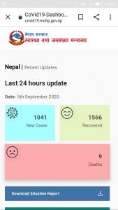 काठमाण्डौ, पछिल्लो २४ घण्टाको अवधिमा देशभर १ हजार ४१ जनामा कोरोना भाईरस संक्रमित (कोभिड-१९) पुष्टी भएको छ | आज थप ९ जनाको मृत्यु भएको छ |