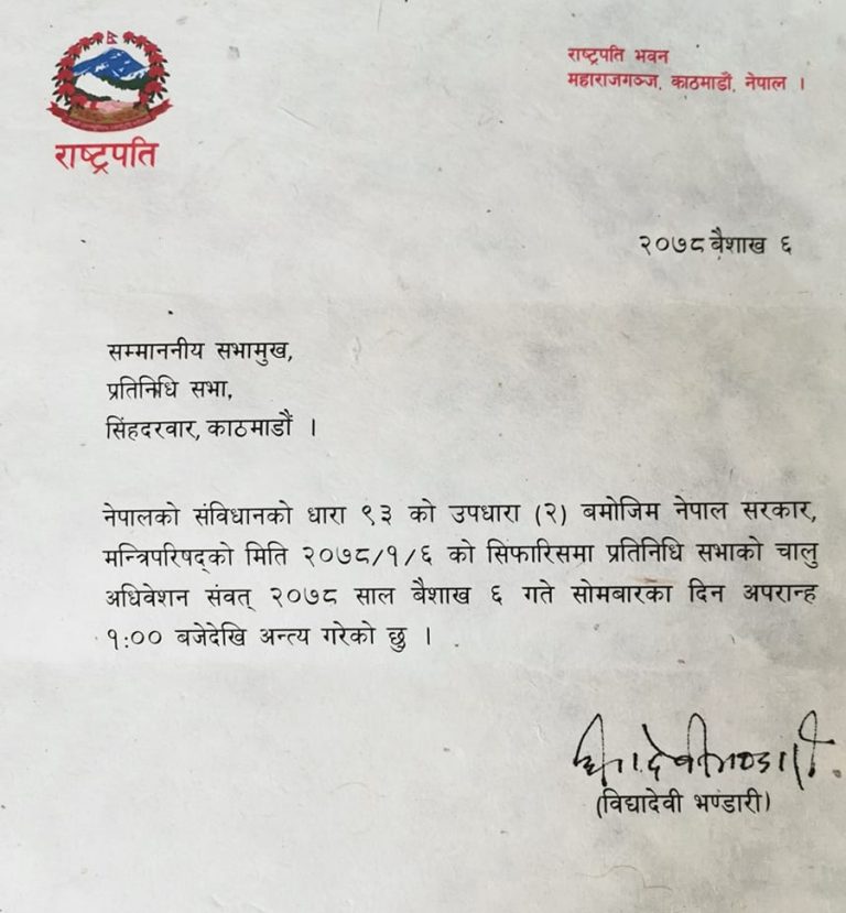 राष्ट्रपतिले सभामुख अग्नि प्रसाद सापकोटालाई प्रेषित गरेको पत्रमा भनिएको छ, “नेपालको संविधानको धारा ९३ को उपधारा २ बमोजिम नेपाल सरकार, मन्त्रिपरिषद्को मिति २०७८ वैशाख ६ को सिफारिसमा प्रतिनिधिसभाको चालू अधिवेशन संवत् २०७८ साल वैशाख ६ गते सोमबारका दिन अपरान्ह १ बजेदेखि अन्त्य गरेको छु।’ उल्लेख गरेको छ ।