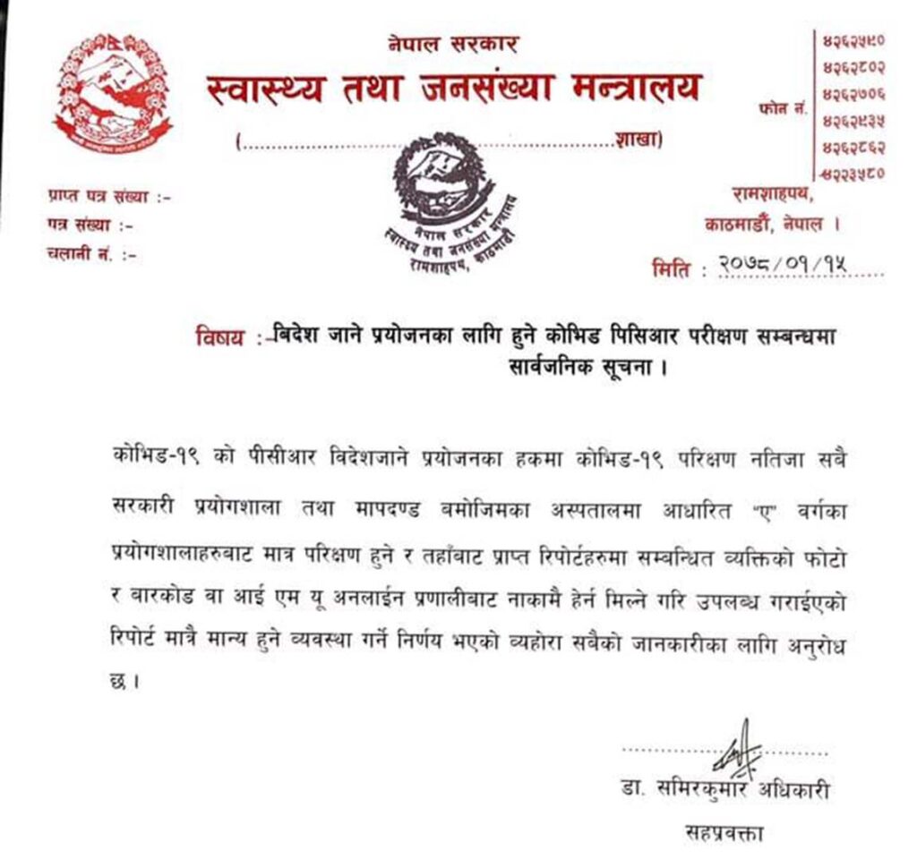 मन्त्रालयले बुधबार एक सूचना जारी गर्दै पीसीआर परीक्षणपछि प्राप्त रिपोर्टमा सम्बन्धित व्यक्तिको फोटो, वारकोड वा आई एम यू अनलाइन प्रणालीबाट नाकामै हेर्न मिल्ने गरी उपलब्ध गराईएको रिपोर्टमात्र मान्यता हुने व्यवस्था गरेको छ।