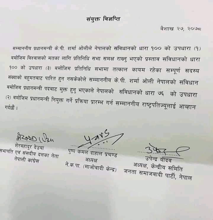काठमाडौँ- तीन दलले नयाँ प्रधानमन्त्रीको नियुक्ति प्रक्रिया प्रारम्भ गर्न राष्ट्रपतिलाई आह्वान गरेका छन् । नेपाली कांग्रेस, ने.क.पा (माओबादी) र जनता समाजबादी पार्टी, नेपालले संयुक्त रुपमा विज्ञप्ति गरी संविधानको धारा ७६ को २ अनुसार प्रधानमन्त्रीको नियुक्ति प्रक्रिया प्रारम्भ गर्न राष्ट्रपतिलाई आह्वान गरेका छन् ।