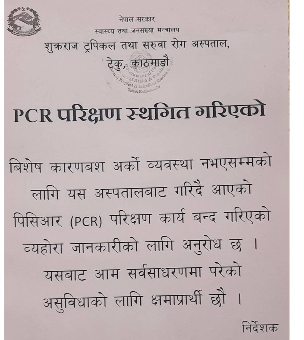 विशेष कारणवश अर्को व्यवस्था नभएसम्मका लागि यस अस्पतालबाट गरिदै आएको पीसीआर परीक्षण कार्य बन्द गरेको अस्पतालका निर्देशकले जनाएका छन्।