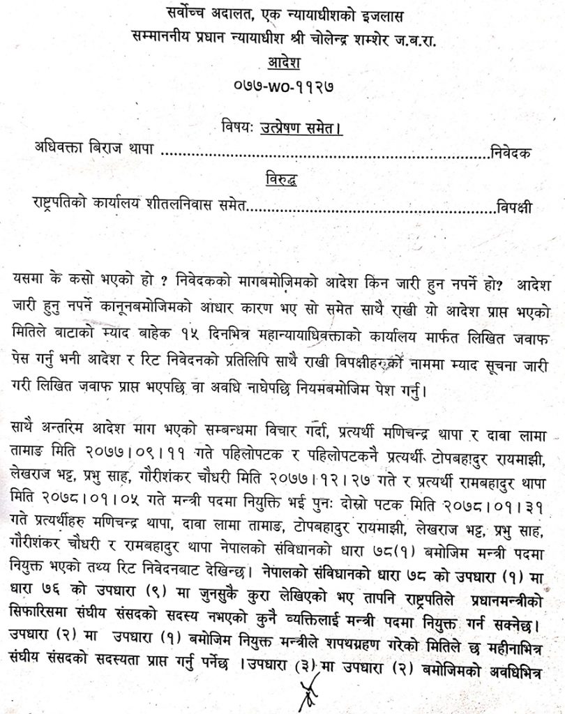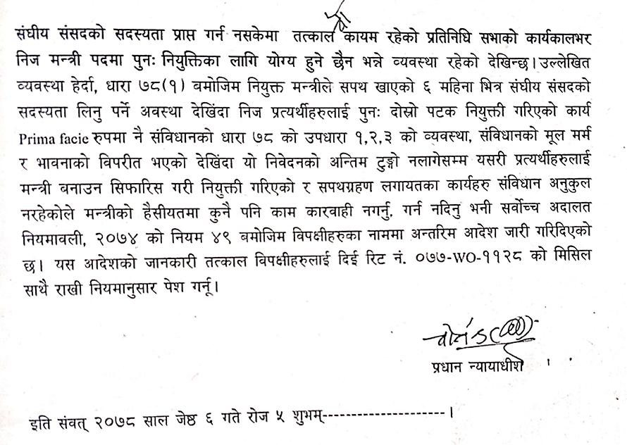 आदेशमा भनिएको छ ‘संविधानको धारा ७८ (१) बमोजिम नियुक्त मन्त्रीले सपथ खाएको ६ महिना भित्र संघीय संसदको सदस्यता लिनु पर्ने अवस्था देखिंदा निज प्रत्यर्थीहरुलाई पुनः दोस्रो पटक नियुक्ती गरिएको कार्य Prima facic रुपमा नै संविधानको धारा ७८ को उपधारा १,२,३ को व्यवस्था, संविधानको मूल मर्म र भावनाको विपरीत भएको देखिदा यो निवेदनको अन्तिम टुङ्गो नलागेसम्म यसरी प्रत्यर्थीहरुलाई मन्त्री बनाउन सिफारिस गरी नियुक्ती गरिएको र सपथग्रहण लगायतका कार्यहरु संविधान अनुकुल नरहेकोले मन्त्रीको हैसीयतमा कुनै पनि काम कारवाही नगर्नु, गर्न नदिनु भनी सर्वोच्च अदालत नियमावली, २०७४ को नियम ४९ बमोजिम विपक्षीहरुका नाममा अन्तरिम आदेश जारी गरिदिएको छ।”