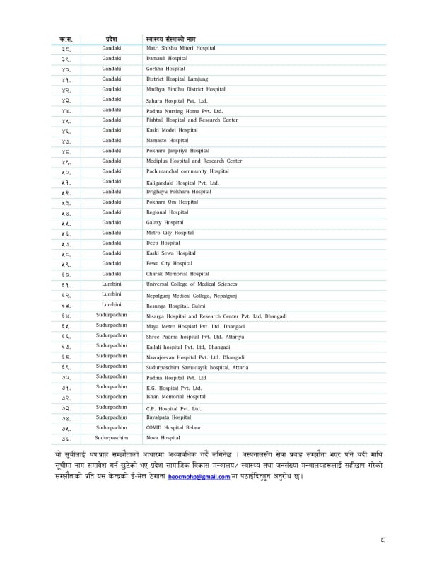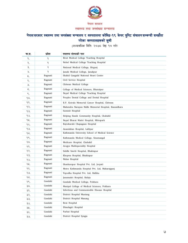 नेपाल सरकार स्वास्थ्य तथा जनसंख्या मन्त्रालयले अस्पतालमा कोभिड-१९ केयर युनिट संचालन सम्बन्धी सम्झौता गरेका अस्पतालहरुको अध्यावधिक विवरण यस प्रकार रहेका छन् ।
