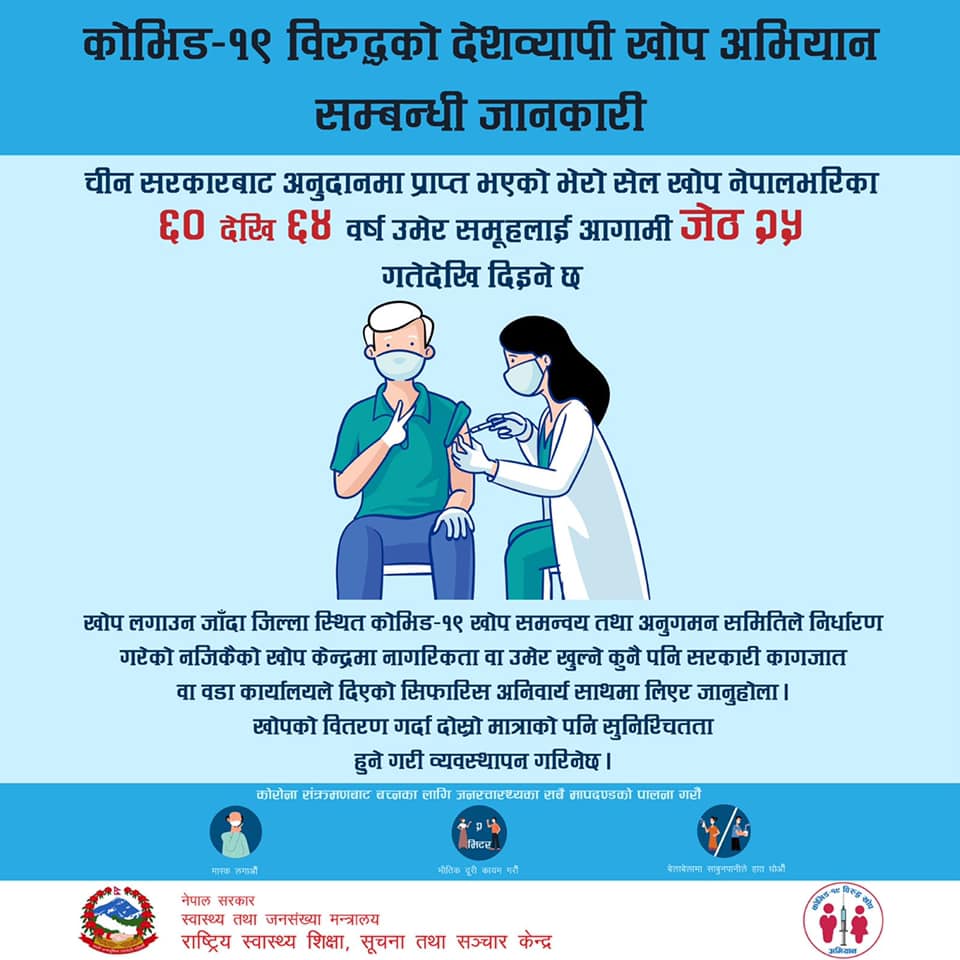 स्वास्थ्य तथा जनसंख्या मन्त्रालयले चीन सरकारबाट अनुदान प्राप्त भेरोसेल खोप नेपालभरि ६० देखि ६४ उमेर समुहलाई लगाउने भएको हो ।