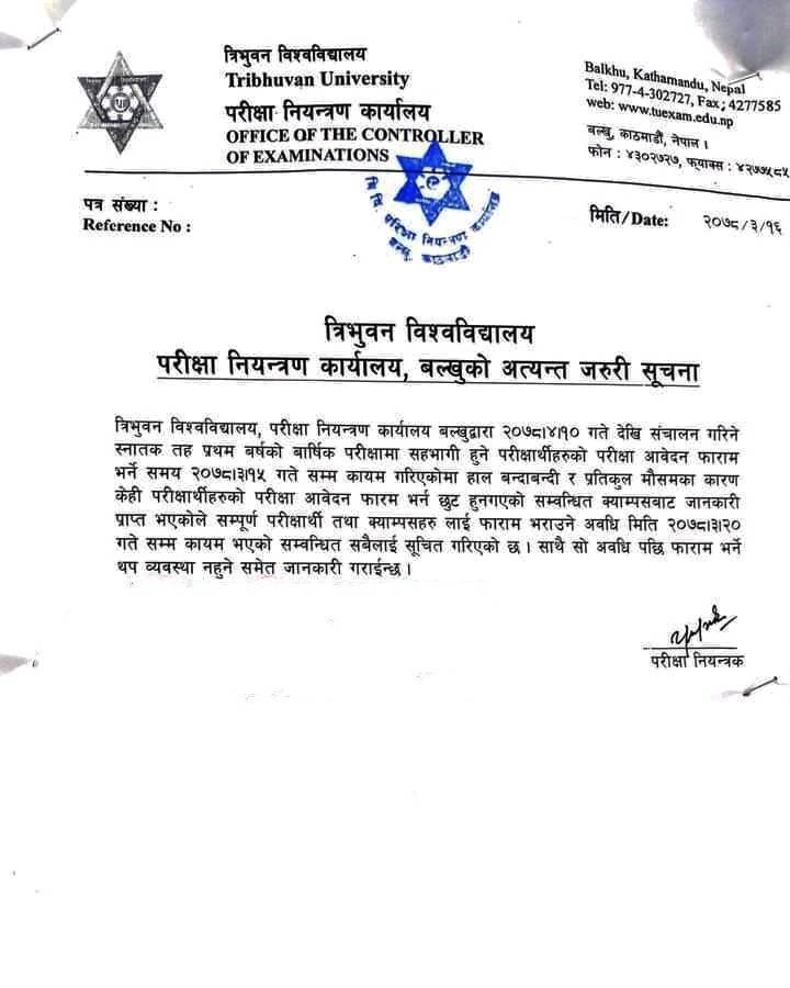 काठमाडौँ- त्रिभुवन विश्वविद्यालय, परीक्षा नियन्त्रण कार्यालय, बल्खुले स्नातक तह प्रथम वर्षको परीक्षा आवेदन फारम भर्ने समय असार २० गते सम्म थप गरेको छ ।