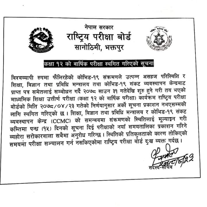 शनिबार बसेको बोर्डको बैठकले अर्को सूचना प्रकाशन नहुन्जेल सम्मका लागि परीक्षा स्थगित गरेको जनाएको छ । बोर्डले संक्रमणको स्थिति मुल्यांकन गरी कम्तिमा पन्ध्र दिनको सूचना जारी गरि परीक्षाको समय तालिका प्रकाशित गर्ने बताएको छ ।