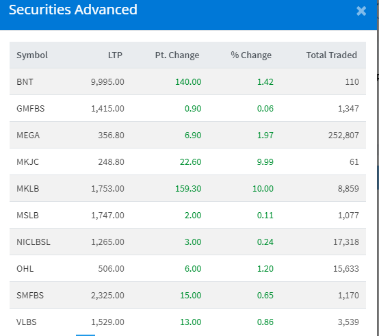 बजार बन्द हुने समयमा १० कम्पनिका शेयर मूल्य केहि बढेको छ । आज सर्वाधिक शेयरमूल्य बढ्नेमा मनकामना स्मार्ट लघुवित्त रहेको छ। मनकामना स्मार्टको शेयरमूल्य सर्वाधिक १० प्रतिशतले बढेर १,७७३ मा कारोबार भएको हो ।