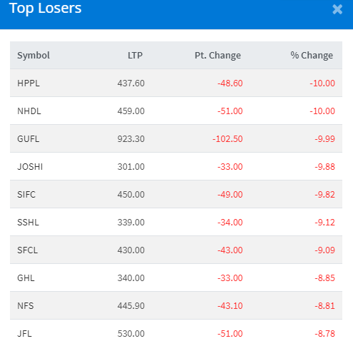 आज धेरै गुमाउनेमा हिमालयन पावर पार्टनर र नेपाल हाईड्रो देभलपर्सको शेयर मुल्य १० प्रतिशतले घटेर अन्तिम मूल्य रू ४३७ र ४५९ कायम भएको हो ।