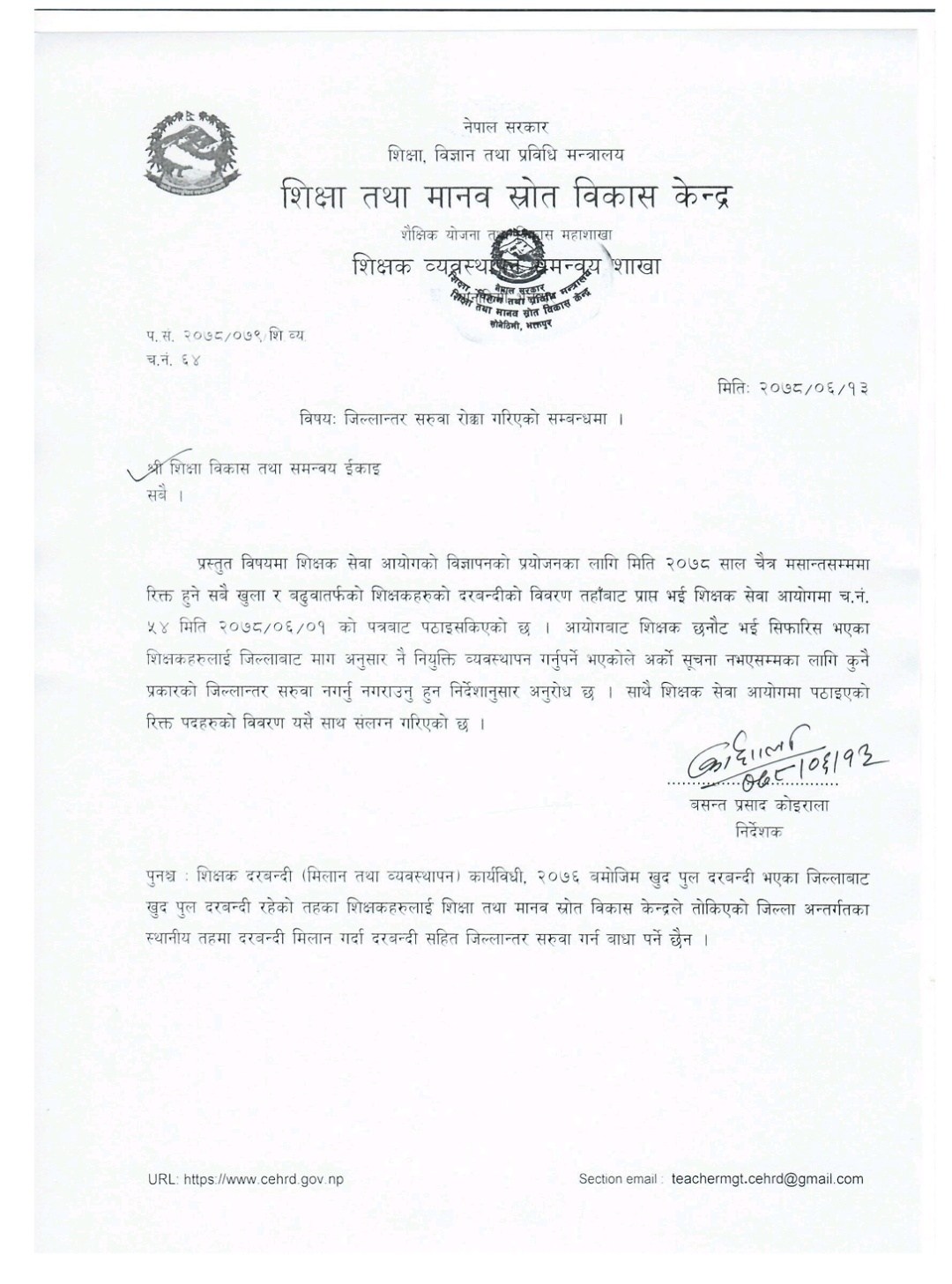 काठमाडौँ- शिक्षा तथा मानव श्रोत विकास केन्द्र, शिक्षक ब्यबस्थापन समन्वय शाखाले शिक्षकहरुको जिल्लान्तर सरुवा रोक्का गरेको छ।आयोगबाट शिक्षक छनौट भई सिफारिस भएका शिक्षकहरुलाई जिल्लाबाटै माग अनुसार नियुक्ति गर्नुपर्ने भएकाले रोक्का गरिएको केन्द्रले उल्लेख गरेको छ ।