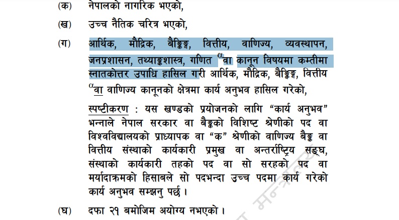 राष्ट्र बैंक ऐन २०५८ को दफा २० ग अनुसार राष्ट्र बैकको गर्भनर हुनको लागि आर्थिक, मौद्रिक, बैंकिङ, वित्तीय, वाणिज्य, व्यवस्थापन, जनप्रशासन, तथ्याड्ढशास्त्र, गणित वा कानून विषयमा कम्तीमा स्नातकोत्तर उपाधि हासिल गरेको हुनुपर्दछ । तर गर्भनर अधिकारीले कुनै खास विषयमा स्नातकोत्तर गरेको तथ्य बाहिर आउन सकेको छैन । गर्भनरको योग्यता सम्बन्धी सूचना माग गरिएको निवेदनमा राष्ट्र बैंकका सूचना अधिकारी नारायण प्रसाद पोखरेलले सूचना नदिने भन्दै निवदेकलाई धम्काएका हुन् ।