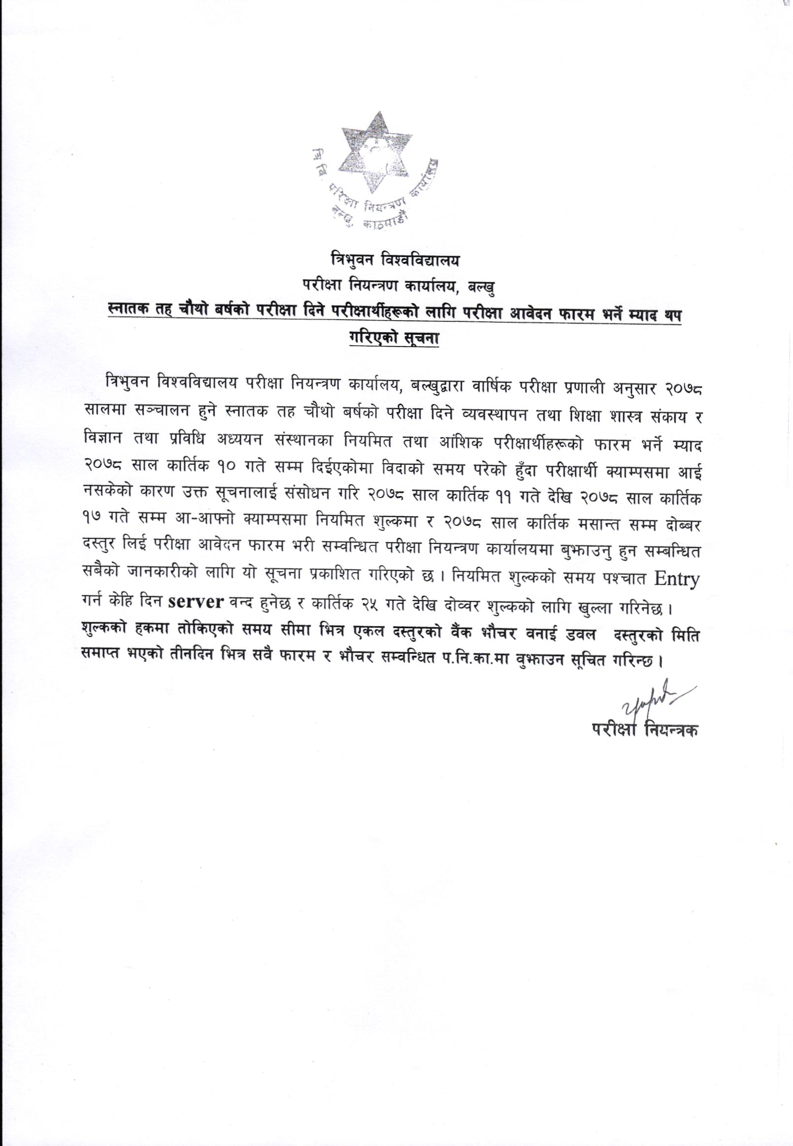 त्रि.वि. ले यस अघि २०७८ साल कार्तिक १० गतेसम्म फारम भर्न आब्हान गरेको थियो । त्यस अवधिमा दशैं विदाको समयमा परीक्षार्थी क्याम्पसमा आई नसकेको कारण उक्त सूचनालाई संसोधन गरि २०७८ साल कार्तिक ११ देखि १७ गतेसम्म आ–आफ्नो क्याम्पसमा नियमित शुल्कमा फारम भर्न सकिने ब्यबस्था गरेको छ ।