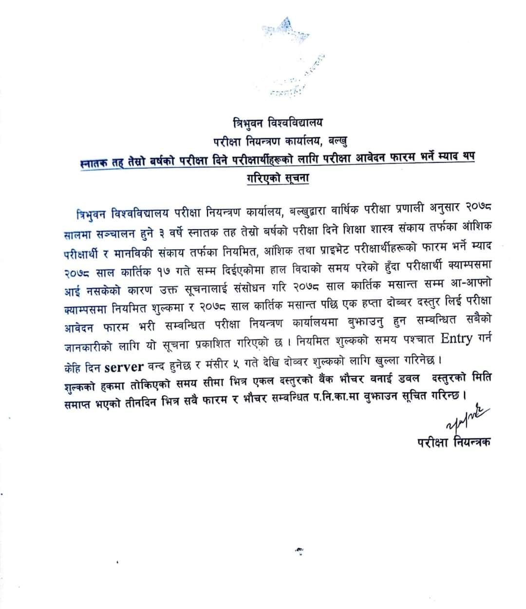 त्रि.वि. ले यस अघि ३ बर्ष स्नातक तह तेस्रो बर्षको शिक्षा शास्त्र संकायको आंशिक र मानविकी तर्फको नियमित, आंशिक तथा प्राईभेट परीक्षा दिने बिधार्थीलाई २०७८ साल कार्तिक १७ गतेसम्म फारम भर्न आब्हान गरेको थियो । त्यस अवधिमा विदाको समय परेकाले परीक्षार्थी क्याम्पसमा आई नसकेको कारण उक्त सूचनालाई संसोधन गरि २०७८ साल कार्तिक मसान्तसम्म आ–आफ्नो क्याम्पसमा नियमित शुल्कमा फारम भर्न सकिने ब्यबस्था गरेको छ ।