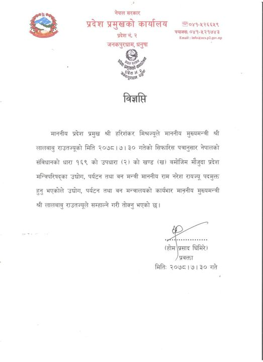 काठमाडौँ- प्रदेश २ का उद्योग, पर्यटन तथा वनमन्त्री राम नरेश राय बर्खास्त भएका छन्।