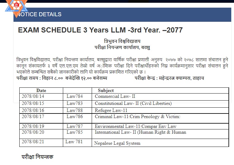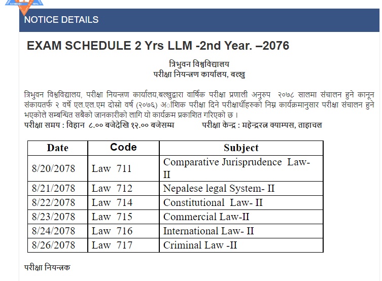 काठमाडौँ- त्रिभुवन विश्वविद्यालय, परीक्षा नियन्त्रण कार्यालय बल्खुले कानुन संकाय अन्तर्गत २ बर्षे एल.एल.एम दोस्रो र ३ बर्ष एल.एल.एम तेर्स्रो वर्षको परीक्षा तालिका सार्वजनिक गरेको छ ।