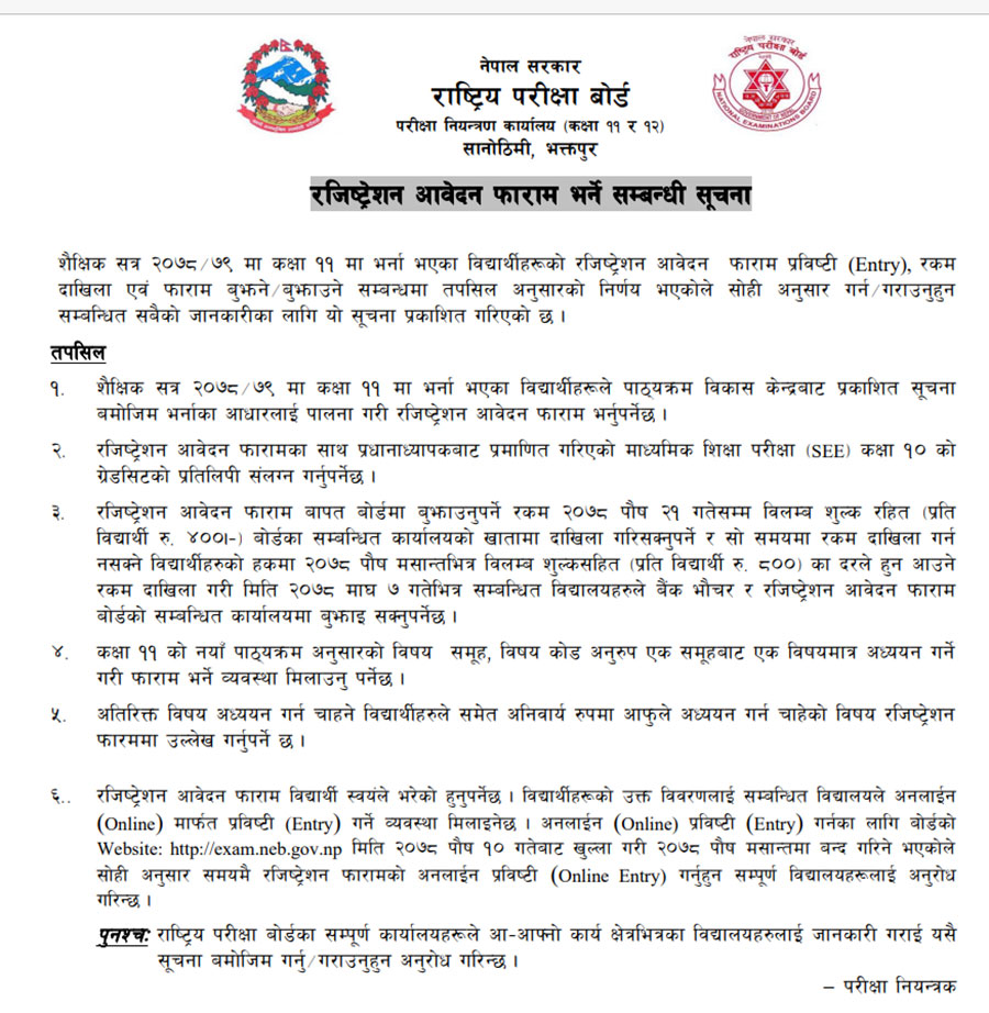 फारम आगामी पुस २१ गतेसम्म बिलम्ब शुल्क बाहेकको रकम तिरी भर्न सकिने र पौष मसान्तसम्म बिलम्ब शुल्क तिरेर भर्न सकिने बोर्डले जनाएको छ।