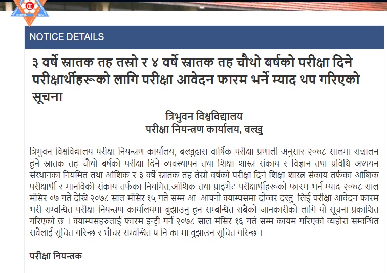 मंगलबार परीक्षा नियन्त्रण कार्यालयले सूचना जारी गर्दै ‘ स्नातक तह चौथो बर्षको परीक्षा दिने व्यवस्थापन तथा शिक्षा शास्त्र संकाय र विज्ञान तथा प्रविधि अध्ययन संस्थानका नियमित तथा आंशिक र ३ वर्षे स्नातक तह तेस्रो वर्षको परीक्षा दिने शिक्षा शास्त्र संकाय तर्फका आंशिक परीक्षार्थी र मानविकी संकाय तर्फका नियमित,आंशिक तथा प्राइभेट परीक्षार्थीहरूको फारम भर्ने म्याद २०७८ साल मंसिर ०७ गते देखि २०७८ साल मंसिर १५ गते सम्म आ–आफ्नो क्याम्पसमा दोव्वर दस्तुर तिरी परीक्षा आवेदन फारम भर्न’ आब्हान गरेको छ ।