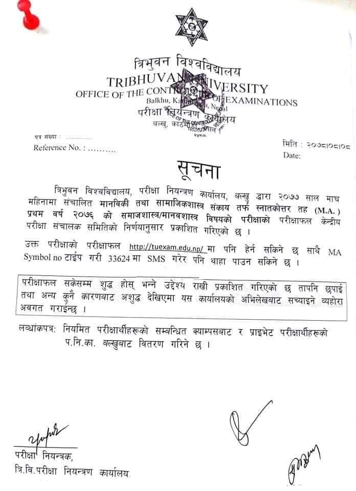 त्रिविले २०७६ माघमा लिएको मानविकी तथा समाजशास्त्र संकायको समाजशास्त्र/मानवशास्त्र बिषयको प्रथम बर्षको नतिजा प्रकाशन गरेको हो ।