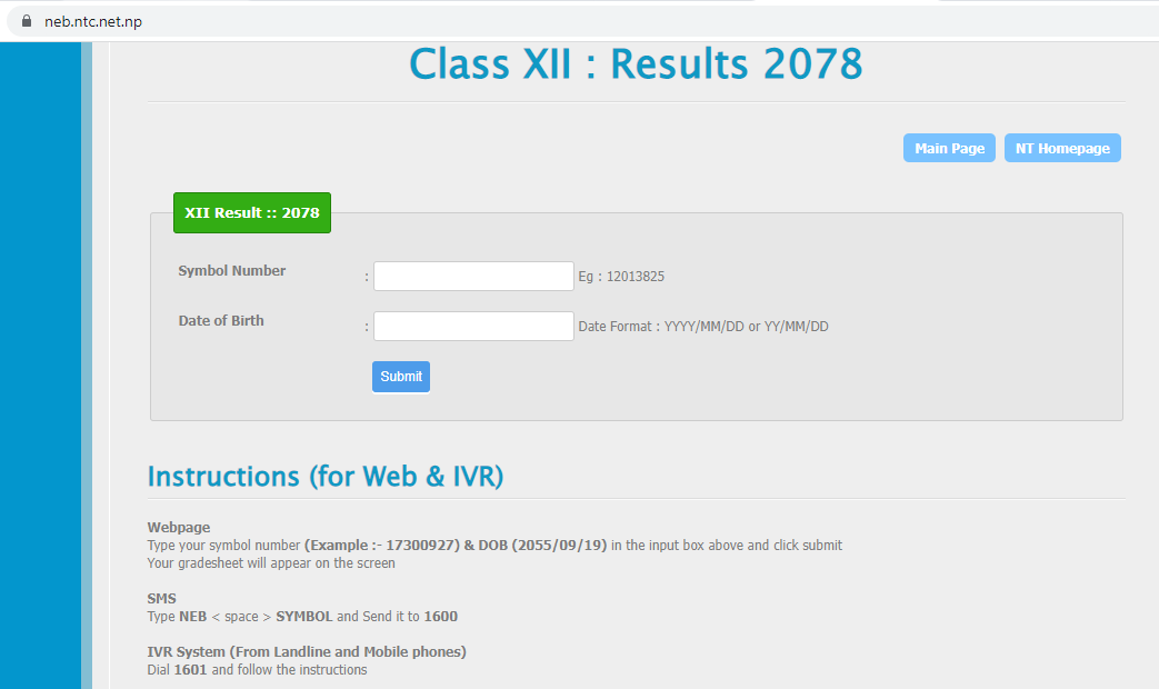 नेपाल टेलिकमको वेभसाइट http://neb.ntc.net.np मा गरेर सिम्बोल नं र जन्ममिति टाइप गरेर हेर्न सकिन्छ । साथै, NEB एक स्पेस छोडी सिम्बोल नम्बर राखेर १६०० मा एस.एम.एस गर्न सकिनेछ । १६०१ मा फोन गरेर प्राप्त निर्देशन अनुसार थाहा [पाउन सकिन्छ ।