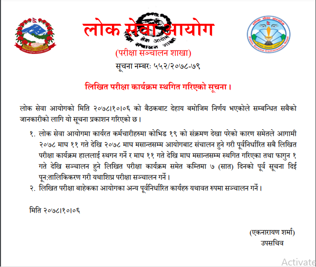 आयोगले निर्णय गर्दै आयोगमा कार्यरत कर्मचारीहरुमा कोभिड-१९ संक्रमण देखा परेको कारणले आगामी माघ ११ गतेदेखि माघ मसान्तसम्म संचालक हुने पुर्व निर्धारित सबै परीक्षा स्थगित गर्ने निर्णय गरेको थियो ।