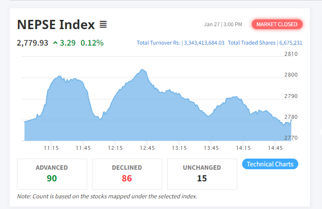 नेपाल स्टक एक्सचेञ्जका अनुसार आज शेयर बजार ०.१२ प्रतिशतले बढेर २७७९.९३ विन्दुमा पुगेर बन्द भएको हो । सेन्सेटिभ इन्डेक्स ०.३८ अंकले बढेर ५१८.७२ विन्दुमा पुगेको छ।