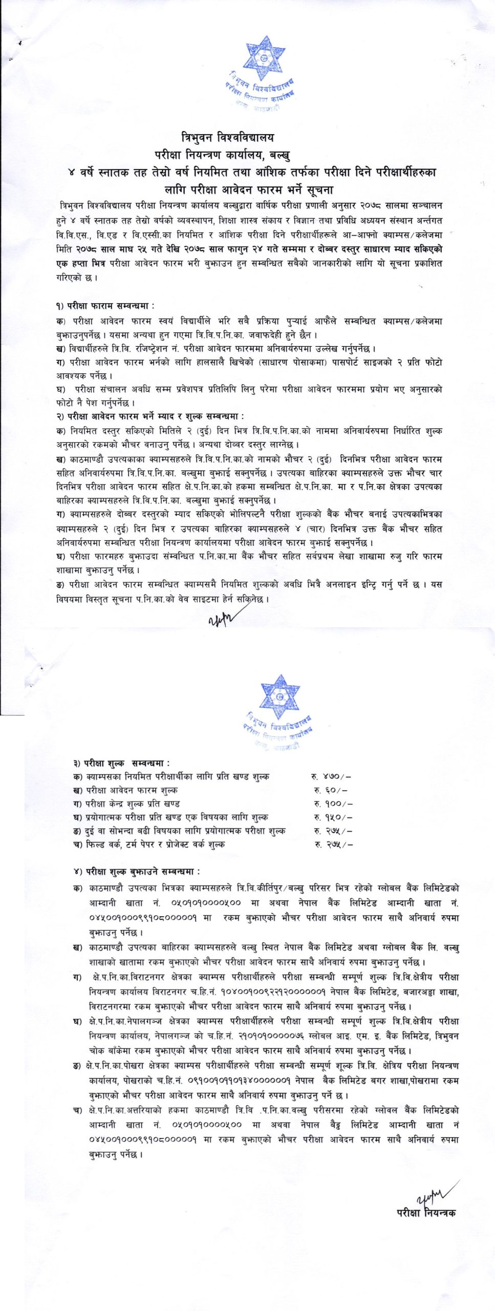 कार्यालयले मंगलबार सूचना जारी गर्दै बार्षिक प्रणाली अनुसार ४ बर्षे स्नातक तह तेस्रो बर्षको ब्यबस्थापन, शिक्षा शास्त्र संकाय र बिज्ञान तथा प्रविधी अध्ययन संस्थान अन्तर्गत वि.वि.एस., वि.एड. र वि.एस्सीका नियमित तथा आंशिक परीक्षा दिने परीक्षार्थीहरूले आ—आफ्नो क्याम्पस\कलेजमा मिति २०७८ साल माघ २५ गते देखि फाल्गुन २४ गते सम्ममा र दोब्बर दस्तुर साधारण म्याद सकिएको एक हप्ता भित्र परीक्षा आवेदन फारम भरी बुझाउन जनाएको छ ।