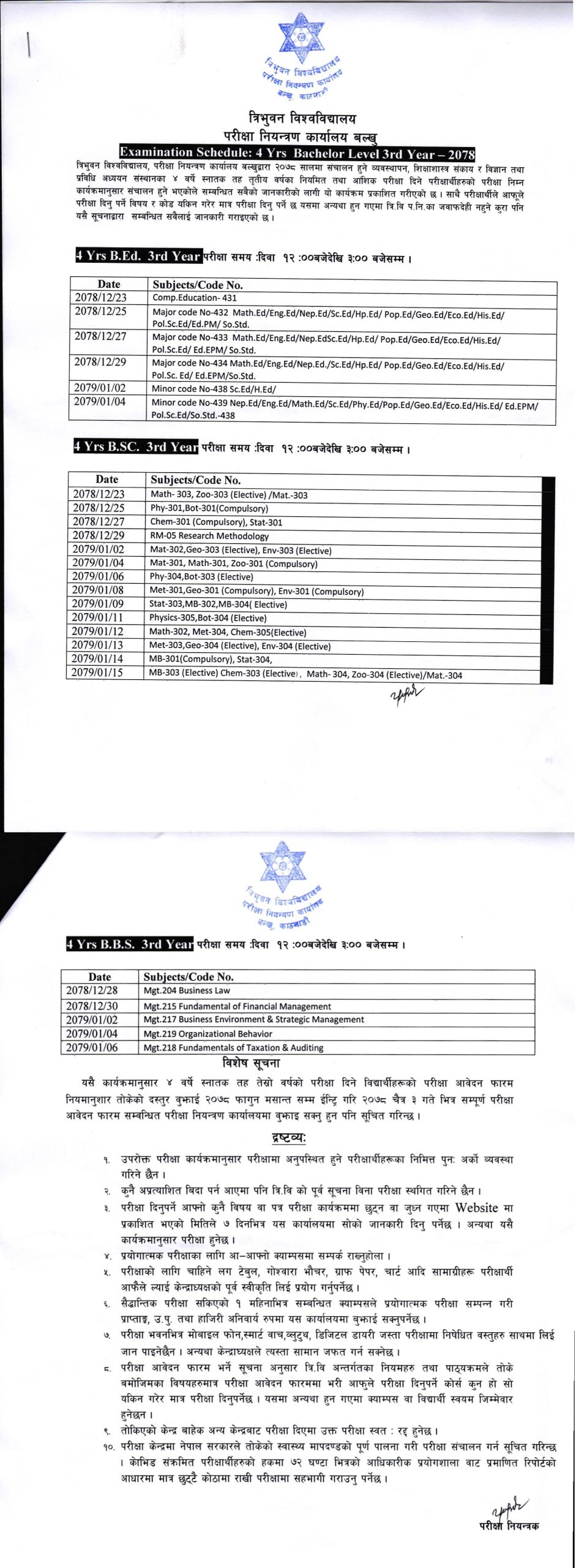 काठमाडौँ- त्रिभुवन विश्वविद्यालय परीक्षा नियन्त्रण कार्यालय बल्खुले ४ वर्षे स्नातक तेस्रो वर्षको ब्यबस्थापन, शिक्षा संकाय र बिज्ञान तथा प्रविधी अध्ययन संस्थानको परीक्षाको तालिका सार्वजनिक गरेको छ ।