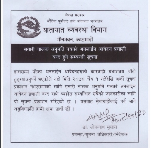 विभागका प्रवक्ता लोकनाथ भुसालले अर्को सूचना प्रकाशन नभएसम्मका लागि सवारी चालक अनुमति पत्रको अनलाइन आवेदन बन्द गरिएको बताएका छन्।