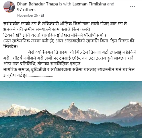 कास्की । सराङ्कोट भन्ने वित्तिकै पोखरा पुगेका र बुझेकाहरूका लागि परिचित नाम हो । माच्छापुच्छ्रे, अन्नपूर्ण, धौवलागरी सहितका हिमालको मनोरम दृश्यावलोकन गर्न सकिने नेपालको एक मात्र ठाउँ पनि सराङ्कोट नै हो । सूर्योदय र सूर्यअस्तदेखि प्याराग्लाइडिङको हब पनि यही सराङ्कोट हो । तर पछिल्लो एक दशक यता यो भूमि स्वार्थ समूहले रजाई गर्ने थलो बनेको छ ।