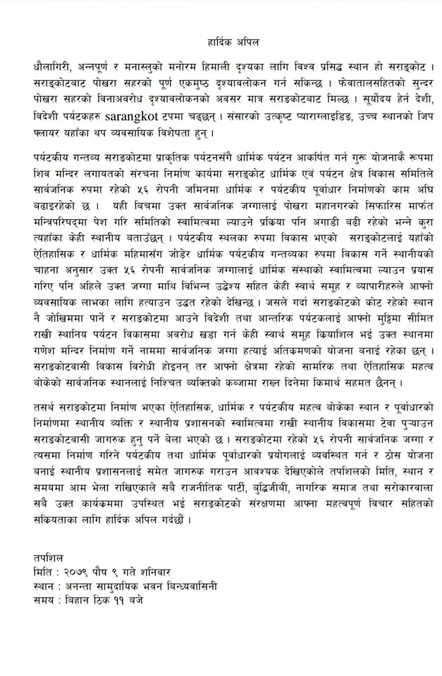 पोखराको सेती बगरदेखि सराङ्कोटसम्म अहिले अन्नपूर्ण केवलकार सञ्चालित छ । यही अन्नपूर्ण केवलकार कम्पनीका सञ्चालकहरूले निहित स्वार्थ पूरा गरी गैर कानूनी रूपमा आर्थिक लाभ लिने प्रपञ्च रचेर सराङ्कोटको टपको सार्वजनिक जग्गामा धमाधम डोजर चलाईरहेका छन् । केवलकारले अपेक्षित आम्दानी गर्न नसकेपछि सराङ्कोटको टपमा ६० फिट अग्लो पञ्चमुखी मूर्ति बनाउने र त्यसलाई देखाएर पर्यटकको ध्यान तान्ने दाउमा रहेको अन्नपूर्ण केवलकारले विभिन्न साँठगाँठ गरी सराङ्कोट सार्वजनिक जगा हत्याएर आफ्नो स्वार्थ पूर्ति गर्ने बाटो रोजेको हो ।