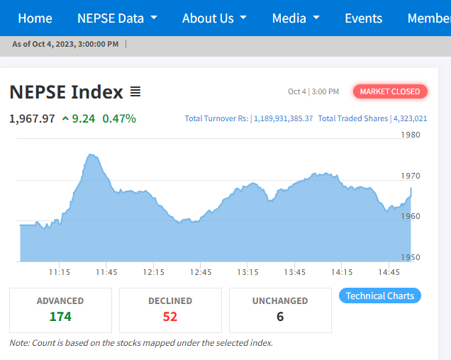 काठमाडौँ, १७ असोज । नेपाल स्टक एक्सचेञ्ज (नेप्से) परिसूचकमा सामान्य अङ्कको सुधार देखिएको छ । आज नेप्से परिसूचक नौ दशमलव २४ अङ्कले बढेर एक हजार नौ सय ६७ दशमलव ९७ को बिन्दुमा कायम भएको हो । आज दुई सय ८४ कम्पनीको ४३ लाख २३ हजार २१ कित्ता शेयर ५८ हजार सात सय ४१ पटक खरिदबिक्री हुँदा रु एक अर्ब १८ करोड ९९ लाख ३१ हजार तीन सय ८५ बराबरको कारोबार भएको नेप्सेले जनाएको छ ।