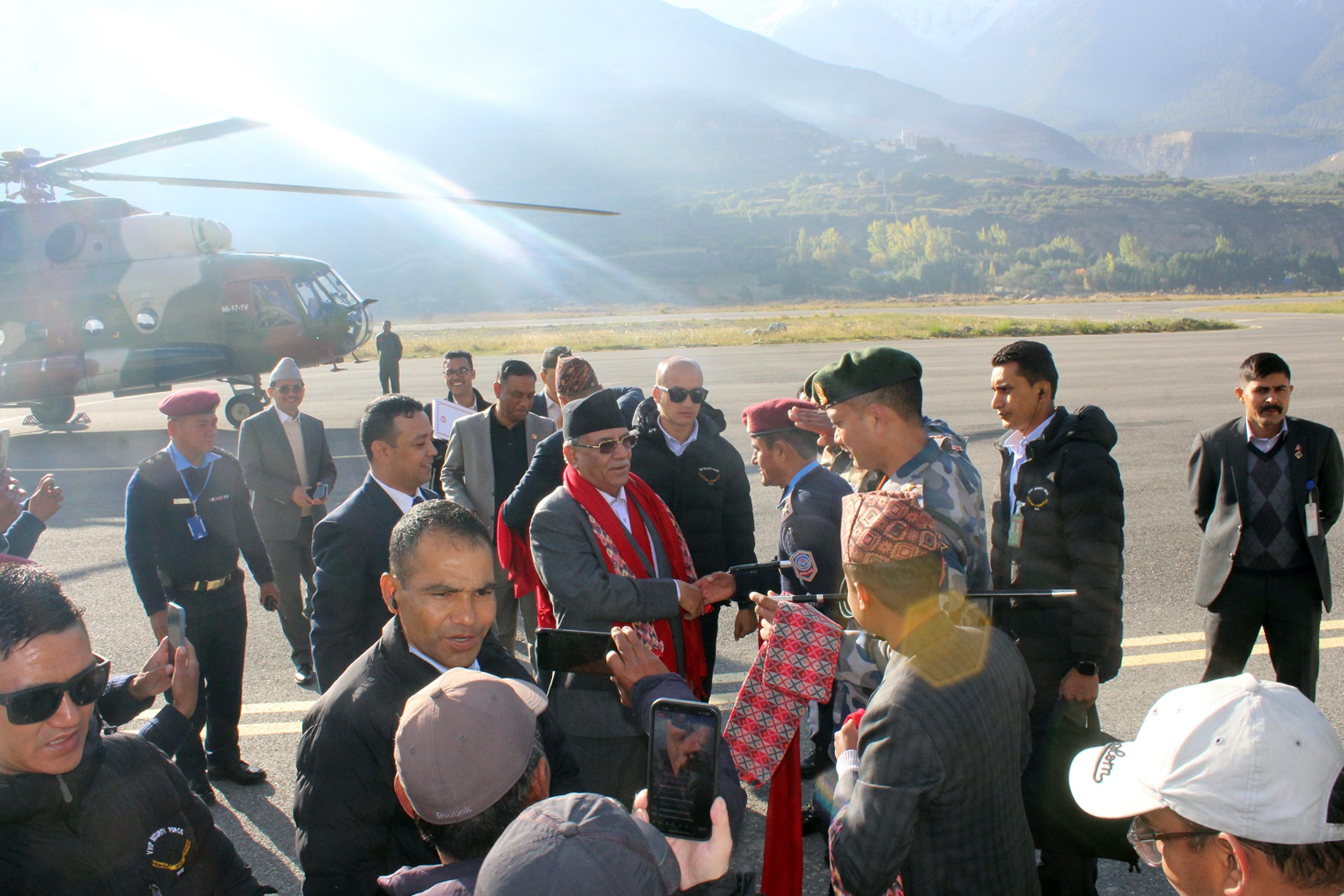 नेपाली सेनाको हेलिकोप्टरमार्फत बिहान जोमसोम आउनुुभएका प्रधानमन्त्री दाहाल कोरलानाका, गत साउनको बाढीले क्षति पुुगेको कागबेनीलगायत क्षेत्रको अनुुगमनमा आउनुुभएको मुुस्ताङका प्रमुख जिल्ला अधिकारी जनकराज पन्तले जानकारी दिनुुभयो । प्रधानमन्त्री दाहालले मुुस्ताङ भ्रमणका क्रममा कोरलानाका र गत साउनको बाढीले क्षति पुुगेको कागबेनीको हवाई निरीक्षण गर्ने कार्यक्रम छ । उहाँले हालै गर्नुभएको चीन भ्रमणका क्रममा मुस्ताङको कोरलालगायत १४ वटा व्यापारिक नाका सञ्चालन गर्ने सहमति भएको थियो ।
